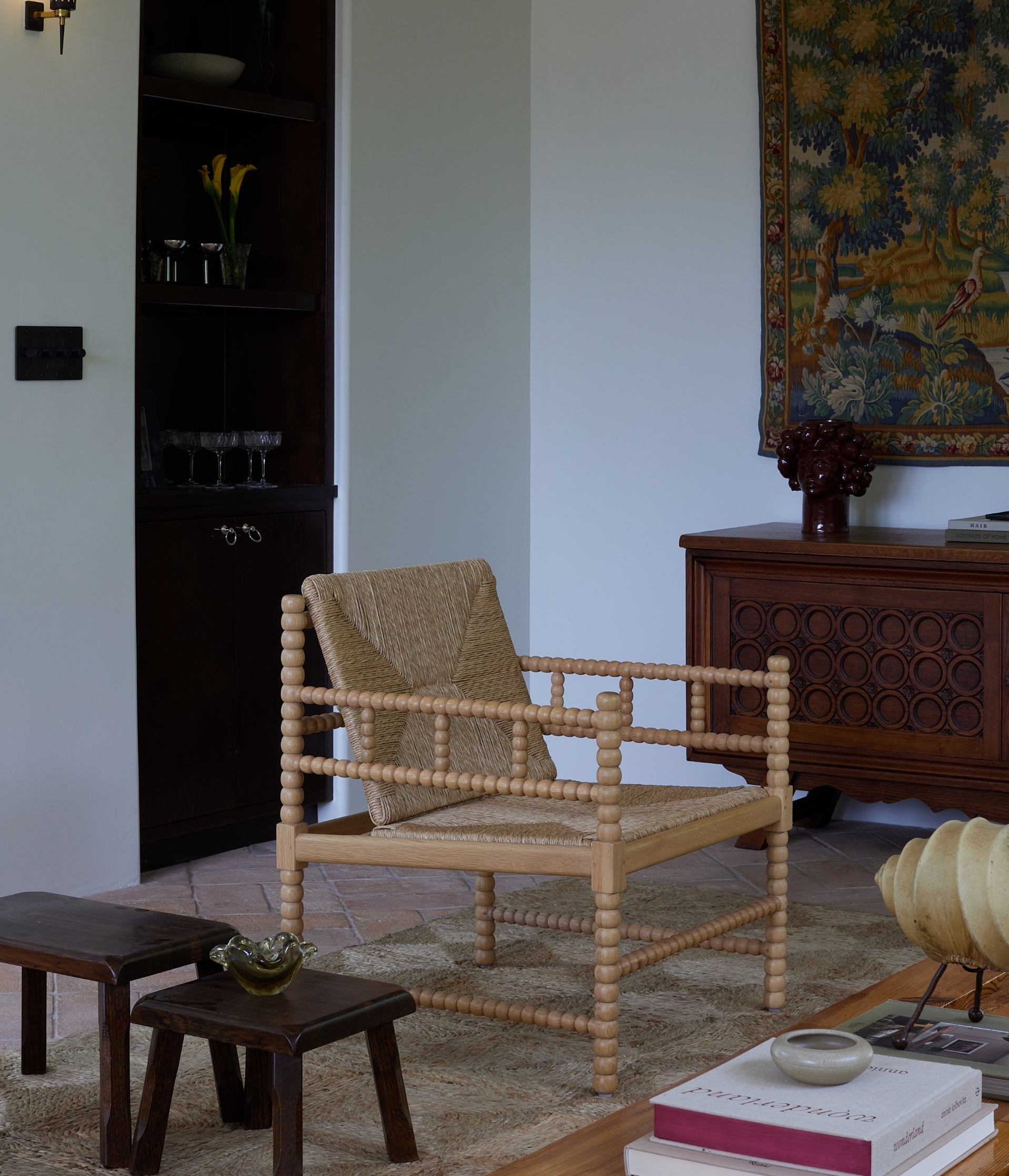 The boble lounge is a testament to craftsmanship. Inspired by the bobbin furniture of 17th century France, this piece features a solid white oak frame and a natural woven rush seat and backrest.