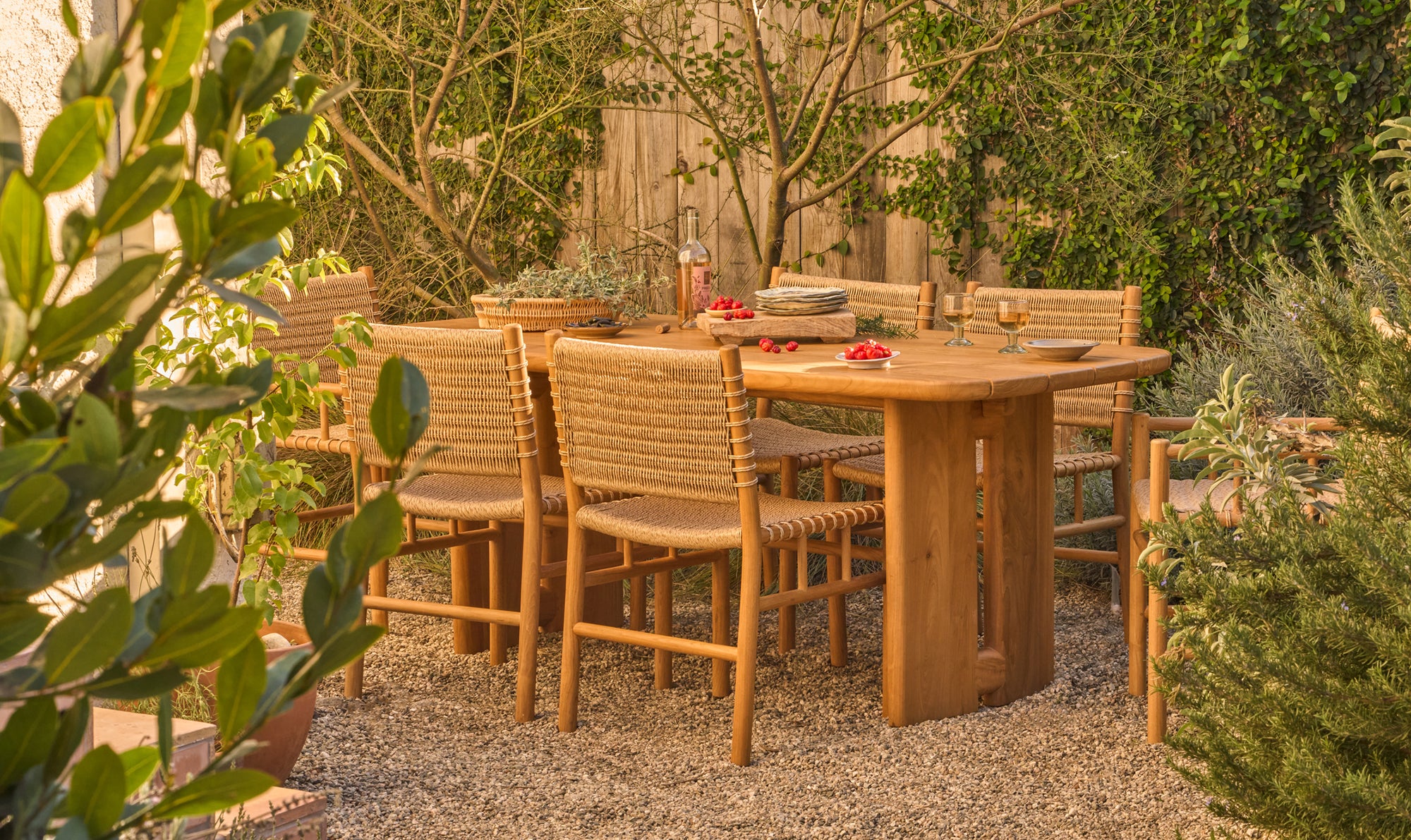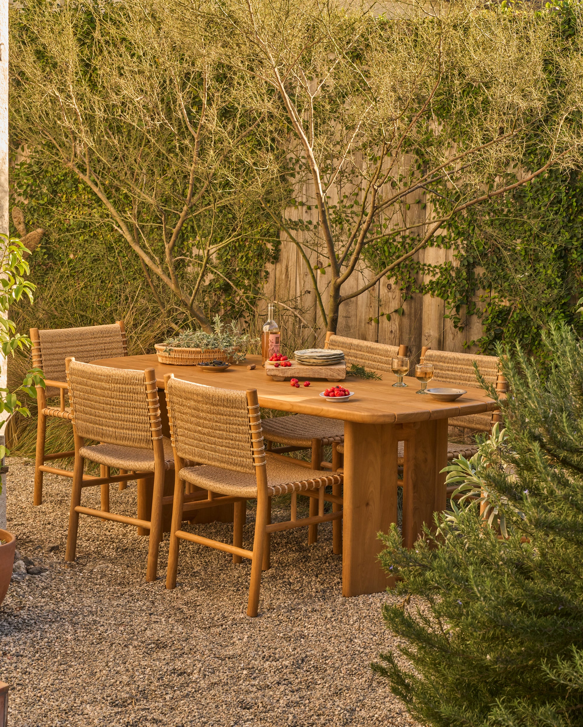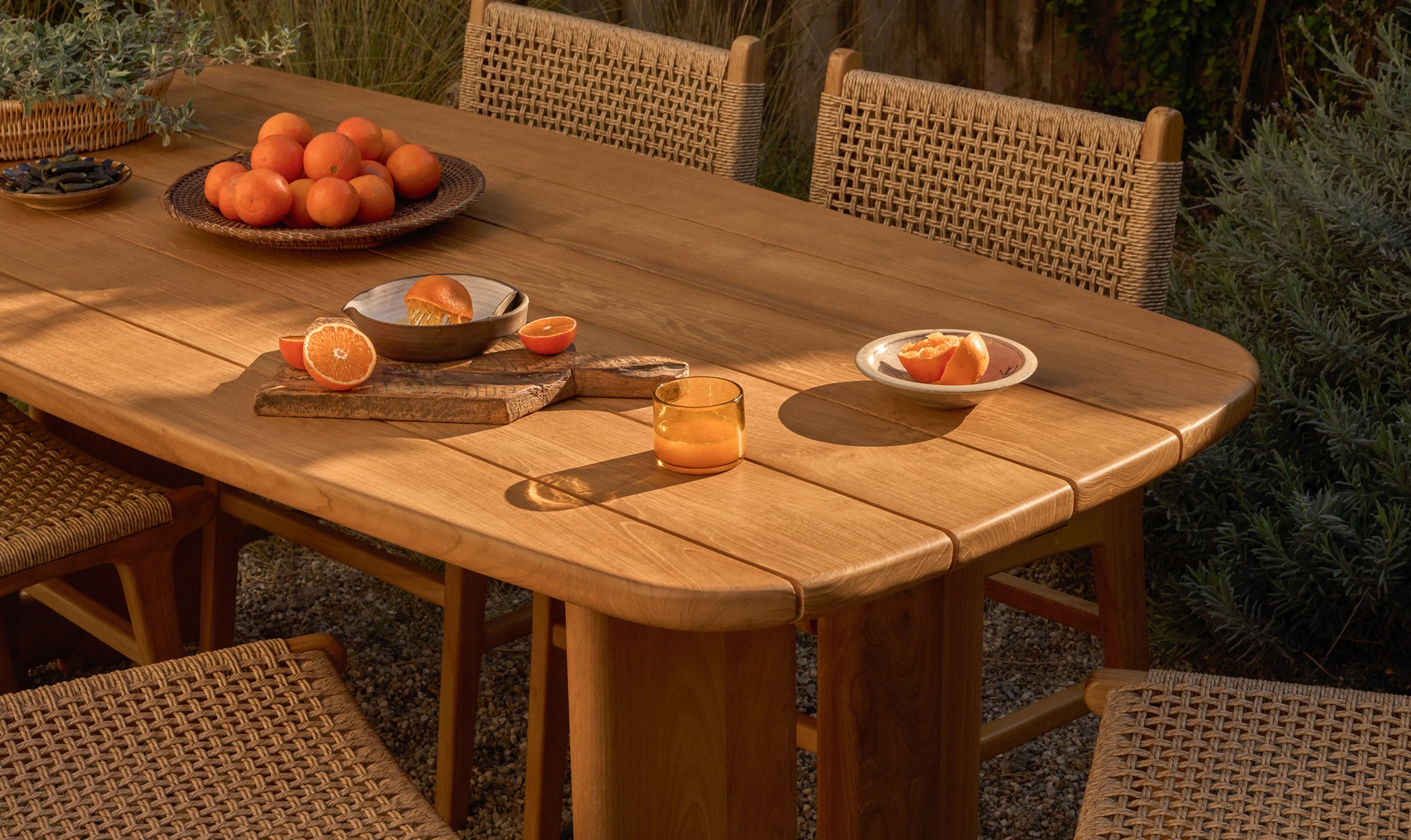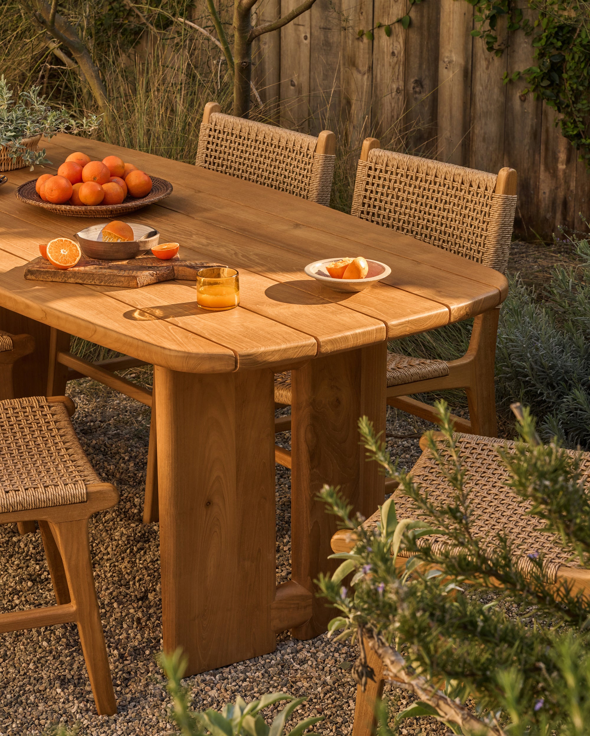 The Hollis Dining Table features organic contours with rounded ends and wide, curved legs. A slatted top lets rainwater flow through, keeping it functional in any weather. Bold yet refined, it’s built to last and stay beautiful through every season. Crafted in solid high-grade classic teak with a neutral finish to complement our outdoor dining collection.
