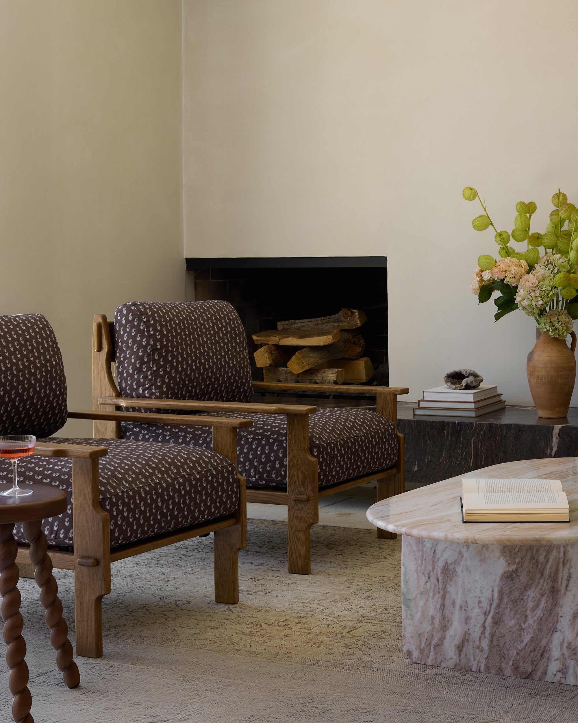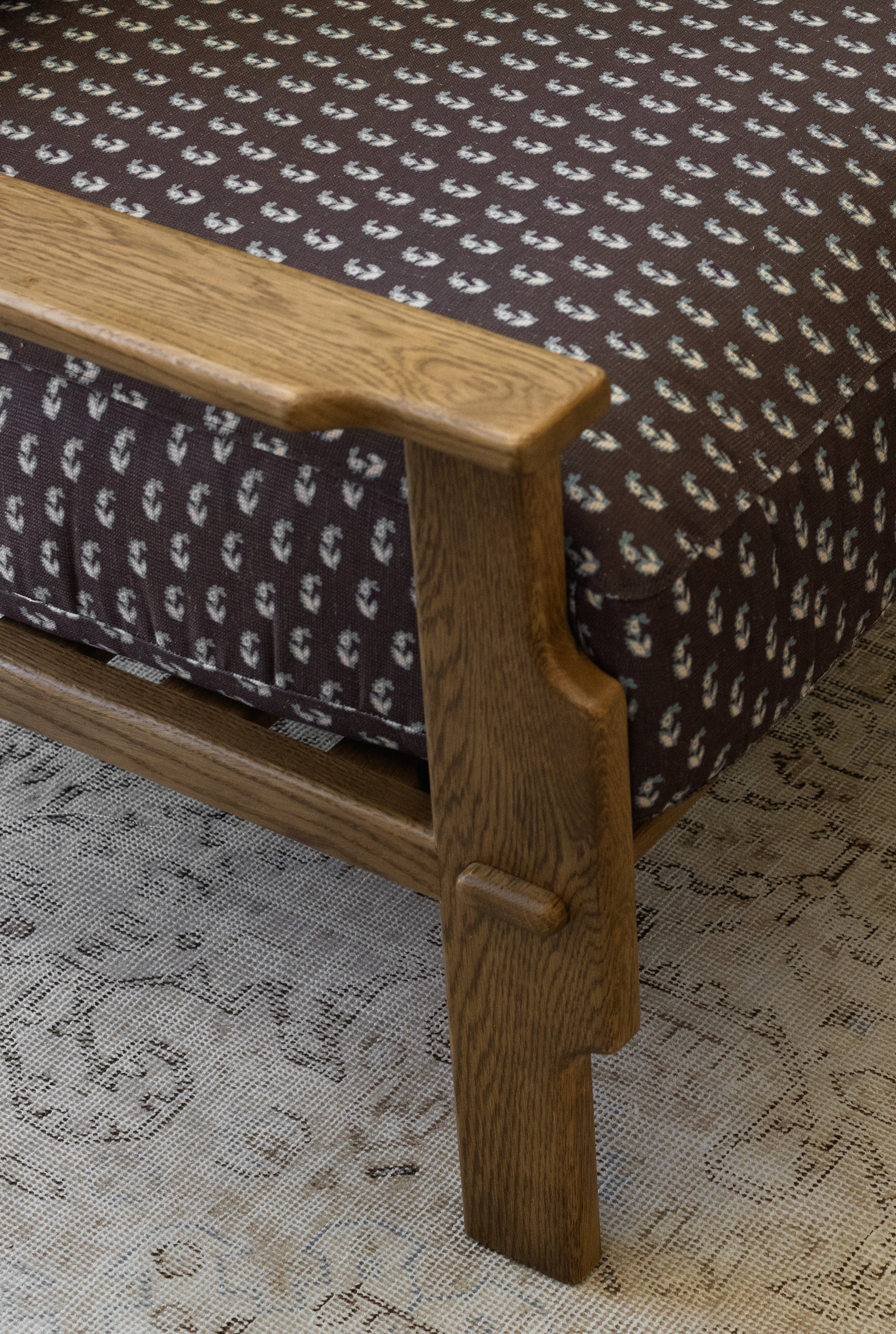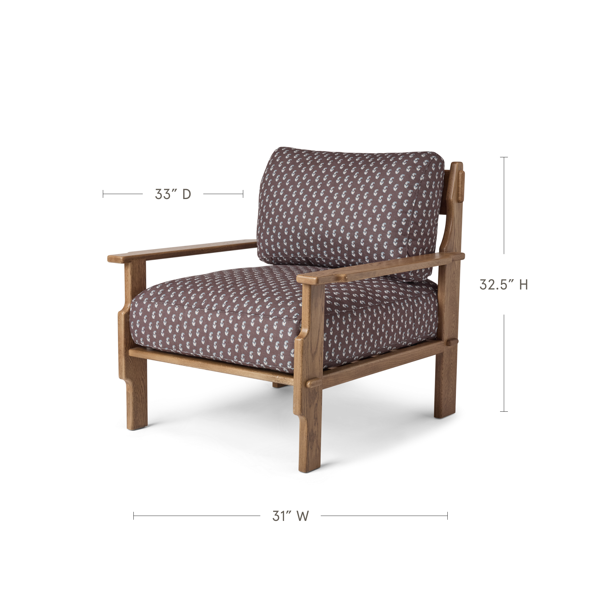 Relaxed, grounded, and built to last. This low-slung lounge chair offers generous, sink-in cushioning wrapped in Cleobella’s signature performance fabrics. The solid honey oak frame showcases warm tones and visible craftsmanship, from the carved armrests to the dowel joinery. A cozy, artful addition to any living space.
