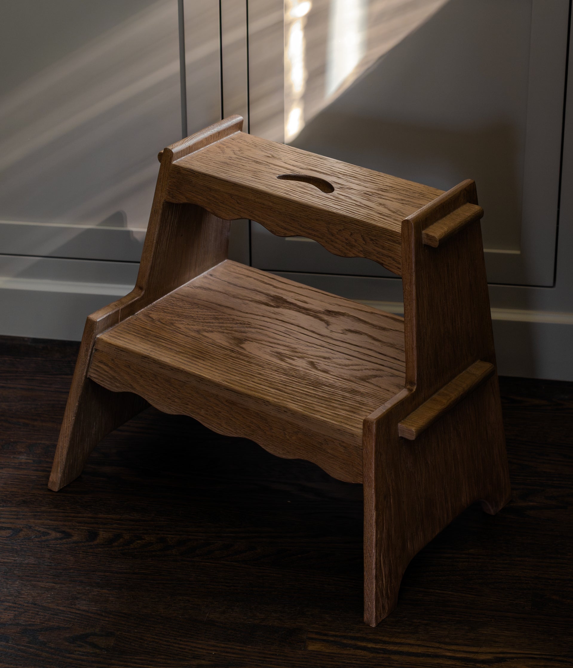 With a convenient built-in hand hole for easy maneuvering and two sturdy steps, this stool is as practical as it is charming. Its wavy scallop detail adds a touch of whimsy, while the solid oak showcases our new Honey Oak finish, slightly weathered for a richer grain and a look brimming with character.
