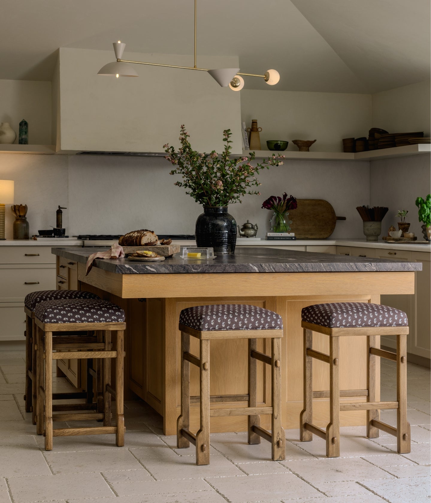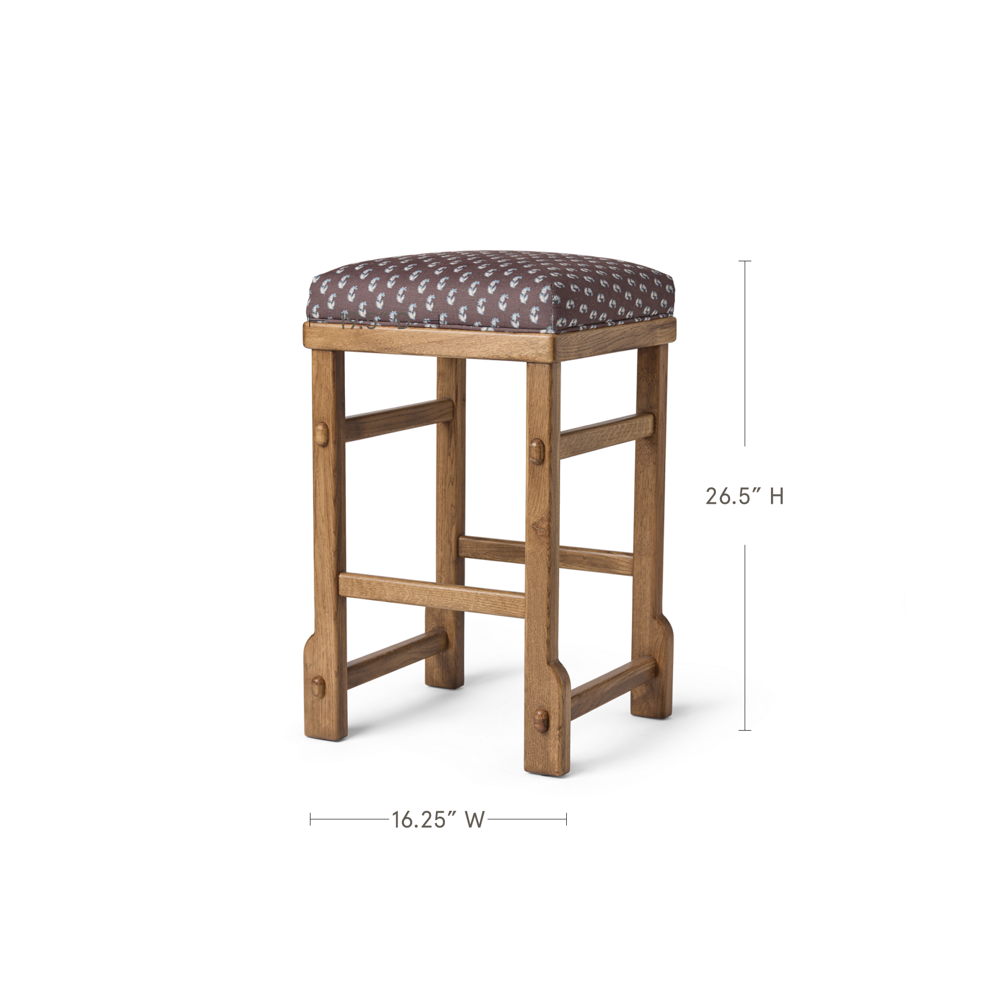 An elevated everyday essential. This handcrafted counter stool pairs a cushioned seat with a solid honey oak frame, complete with rounded pegs and exposed joinery for a timeless, artisan feel. Finished in Cleobella performance fabric, it adds quiet character to kitchens and gathering spaces—designed to look beautiful and live beautifully, too.