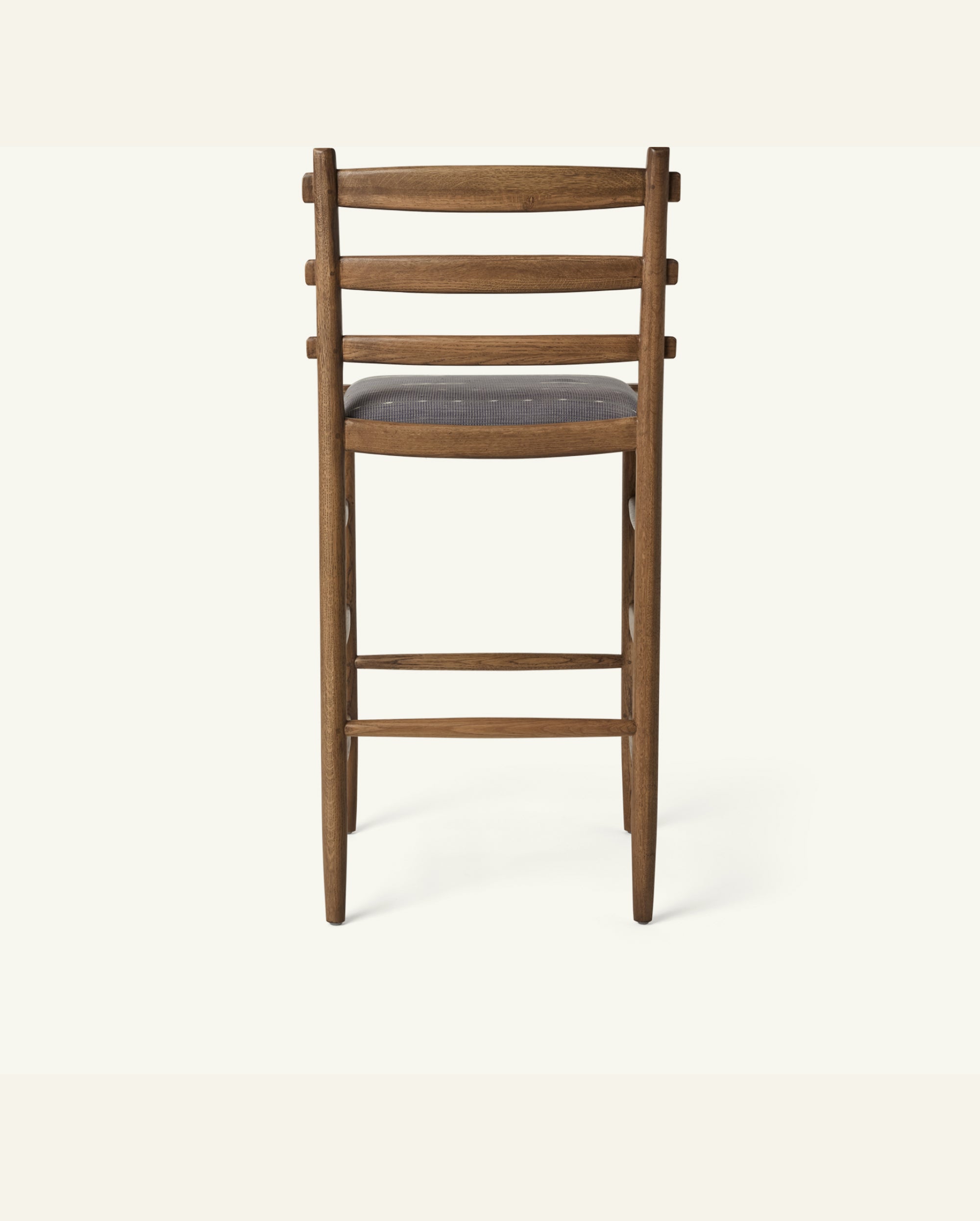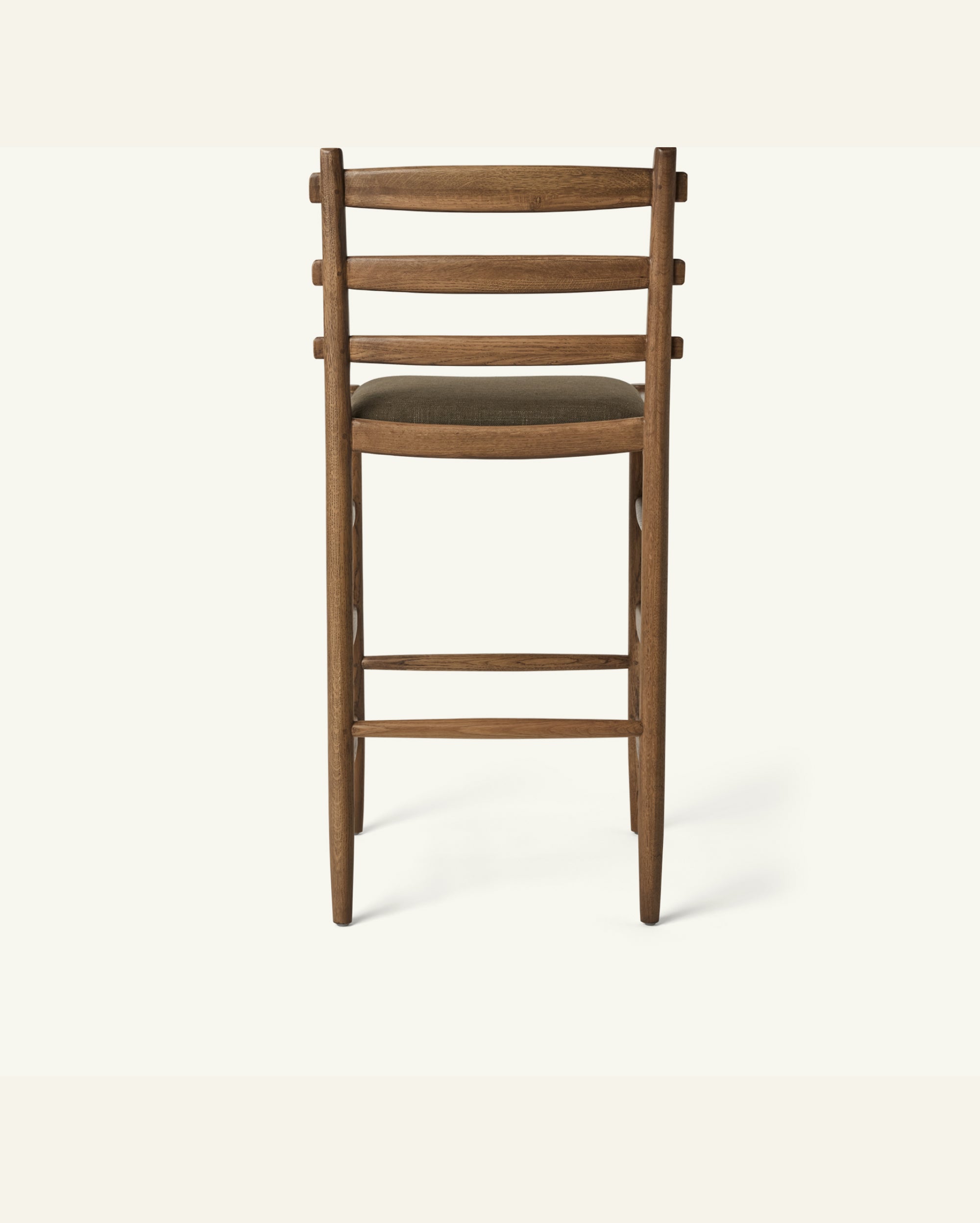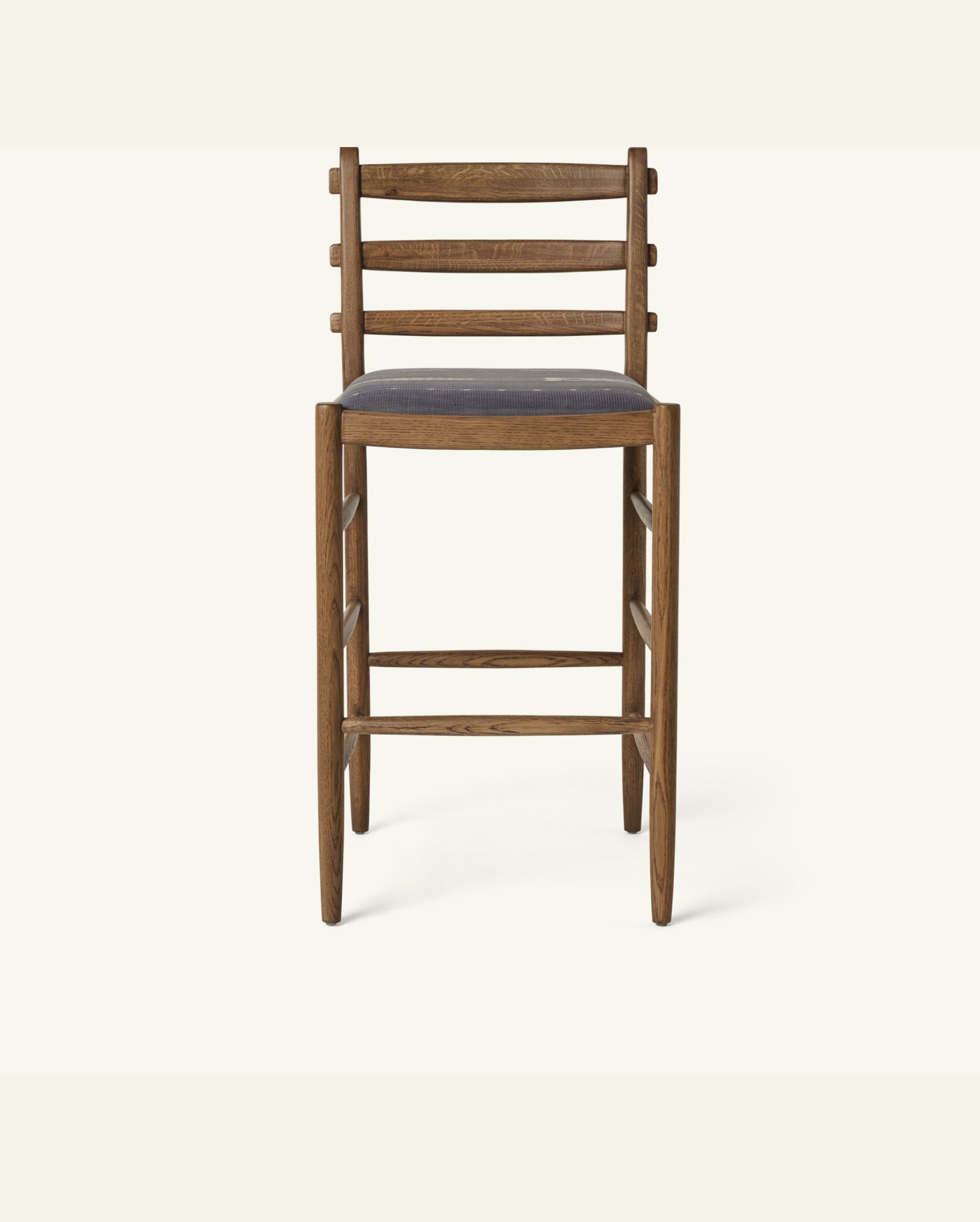 Named after the number "three" in Indonesian, this counter stool boasts a striking three-paneled backrest and three side struts, creating a distinctive and functional silhouette.