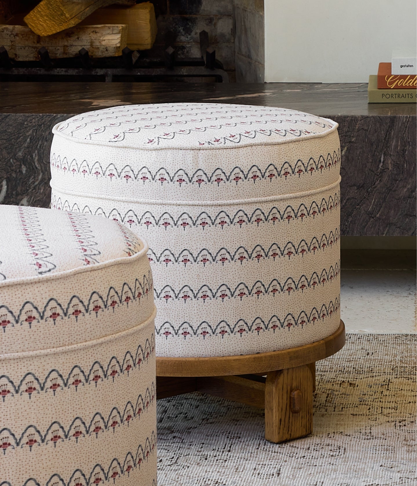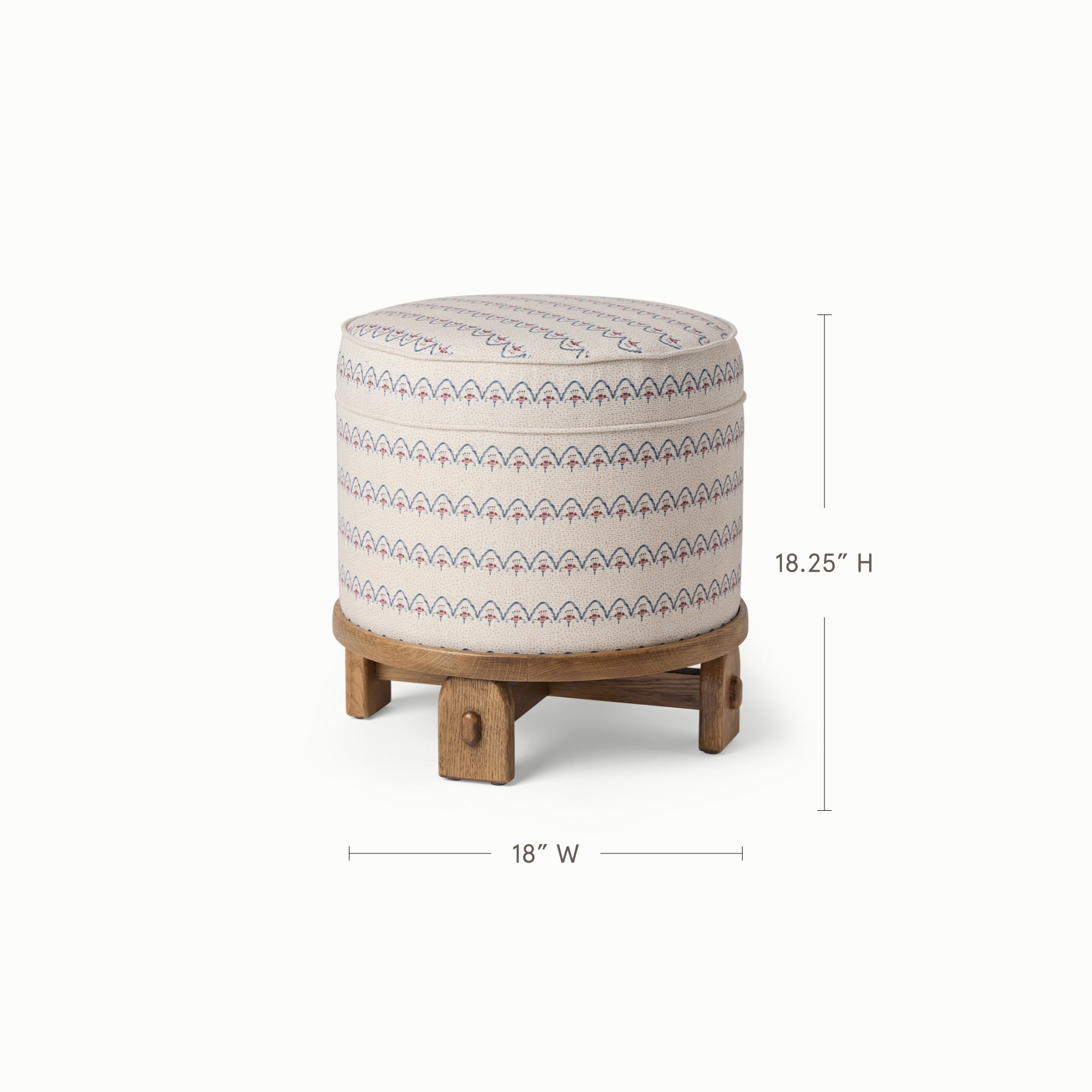 Cylindrical upholstered ottoman with solid oak base